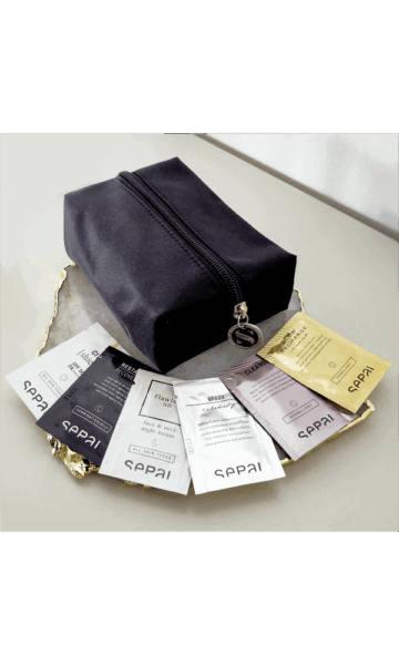 5 muestras de productos Sepai, presentadas en un práctico neceser de Sepai.